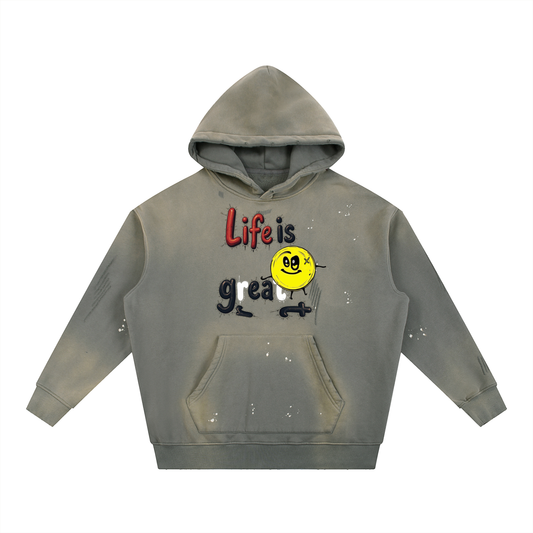 Life Is Great, Vintage Washed Frayed Fleece Hoodie